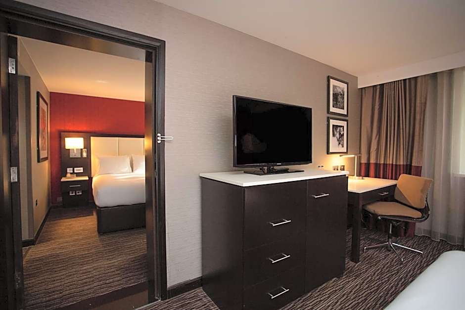 The bedroom provides a comfortable king-sized bed and a sitting area with a double sofa bed. The bathroom has a bathtub and a walk-in rain shower.